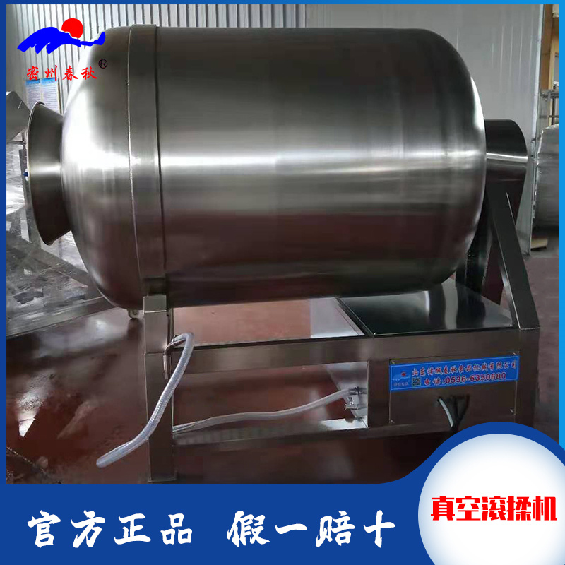 一、裝料:開啟真空泵,使?jié)L筒內(nèi)壓力達(dá)到-0.08Mpa后停止運(yùn)行真空泵,同時(shí)將料車放置在機(jī)器部,將吸料管連接在機(jī)器上,另一端放在料車底部,打開吸料閥,肉料吸入滾筒,完成裝料工作。