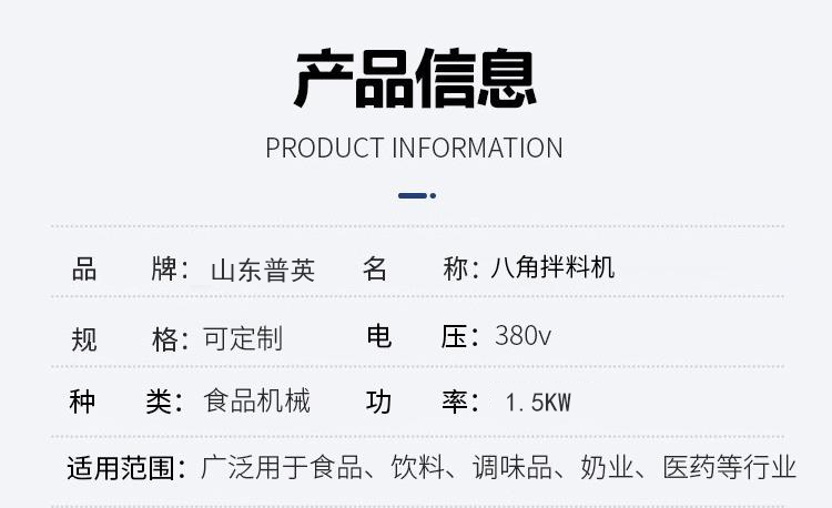 八角拌料機適用于各種食品調味、加料、掛漿等。八角拌料機用于食品加工后期調味粉的攪拌或原料的裹粉包衣以及摻和,結構簡單實用,桶體為不銹鋼八角型設計,能在較短時間內使待加工食品物料與所需調料充分拌合均勻,自動出料,清理消毒方便無死角。