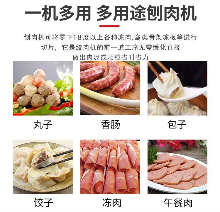 刨肉工藝:可刨零下18度任意無骨凍肉(牛肉、羊肉、魚肉),刨片厚度1-15MM可調(diào),每小時(shí)加工產(chǎn)能達(dá)600-800KG